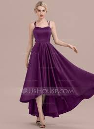 A line sweetheart asymmetrical satin bridesmaid dress. Shaped in an a line silhouette this dress offers a sexy and luxurious look. Styling tips suggested fits offering a classic and versatile design for a wide range of body types the a line silhouette is a perennial favorite. A line princess spaghetti straps satin sleeveless asymmetrical wedding dresses.