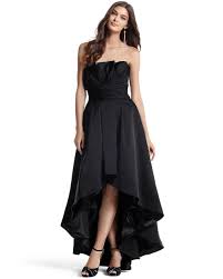 High low bateau sleeveless illusion back satin dress with bow. Black and white high low dress with tiers and ruffles. All of the dresses below are either black or available as a black bridesmaid dress.