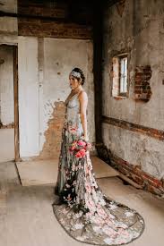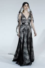 Featuring a dramatic plunging v neck in front and back and scalloped striped lace motif cascading into a flowing full skirt. There s always a way to incorporate bright tones along with muted ones throw in a few surprises and balance everything to keep it in the realm of an autumn ceremony. Exude a mysterious romanticism with the raven dress from claire pettibone.