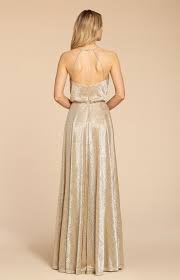 A liquid metallic a line gown racer neckline open back sheer with strap detail natural waist. Shop designer long bridesmaid dress style 52002 by hayley paige occasions. Styles are available.