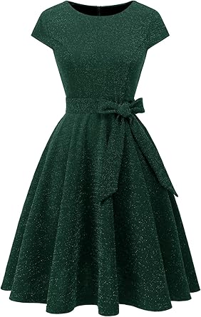 Ivnis Rs90048 Women S Vintage 1950s Rockabilly Cap Sleeve Glitter Cocktail Prom Dresses With Belt Dark Green M Amazon Co Uk Clothing