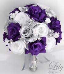 Purple and silver bouquets for weddings. Artificial wedding flowers we purchase in large volume to pass the savings on to you. A lovely purple silk rose anemone brides bouquet with silver berries and plum hydrangea finished with silver satin stem. Or if you re planning a formal affair opt for a bouquet with purple and white roses.
