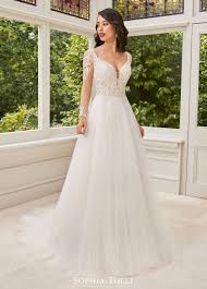 An elegantly sleeved version of camryn this a line gown features a softly gathered misty tulle skirt juxtaposed with a semi sheer bodice richly adorned in beaded schiffli lace appliqués. Sophia tolli wedding dresses by sophia tolli these bridal gowns provide both classic and couture designs including strapless ball gowns a line dresses halters and slim skirts. A subtle allover chantilly lace under layer adds texture to the bodice that offers a plunging curved v neckline with a sheer tulle panel and sophisticated illusion lace long sleeves.