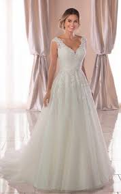 Inspired by the world s hottest red carpet trends stella york bridal gowns are imagined and crafted with exceptional detail. This romantic a line wedding gown from stella york boasts eye catching lace cap sleeves and a scalloped lace illusion back with pretty fabric covered buttons. The gown can be customized with your choice of intricately appliquéd diamantes in silver or gold.