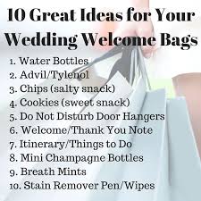 From the minute your guests check into their hotels you have the opportunity to set the tone for the type of celebration you want starting with the wedding welcome bags. Hotels often provide a few complimentary toiletries like shampoo or lotion but not everything is covered. Sunglasses bug spray and fans will beat the heat while pashminas tea bags and hand warmers are perfect for a fall or winter wedding.